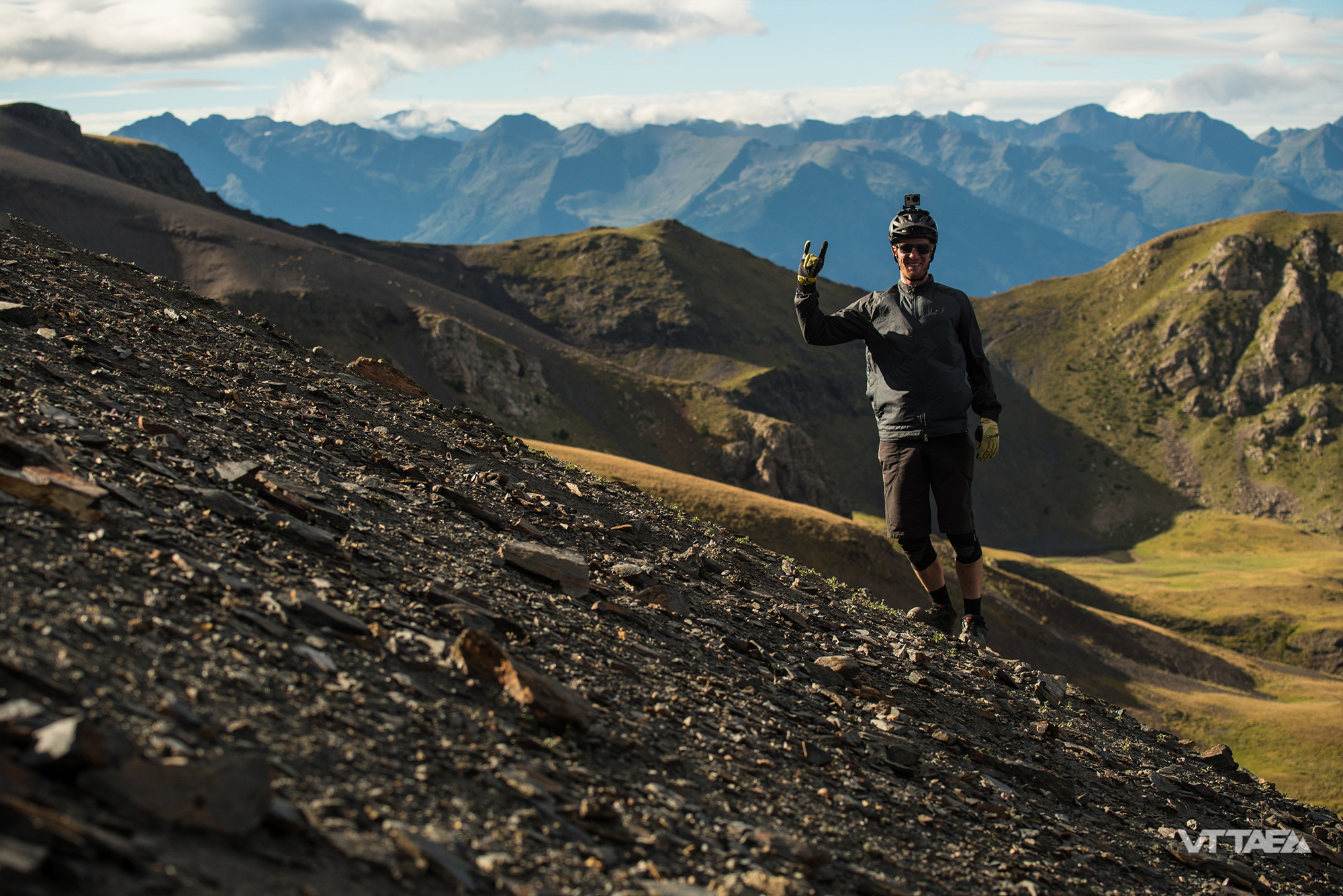 Nous voila partis depuis le Parc Naturlandia, via une dépose sur un point haut, les sacs à dos chargés du matériel de camping, du ravitaillement solide et liquide, du matos photo. Nous longeons la frontière franco-espagnole par une piste large, parfois très raide, où le mode Boost est salvateur.