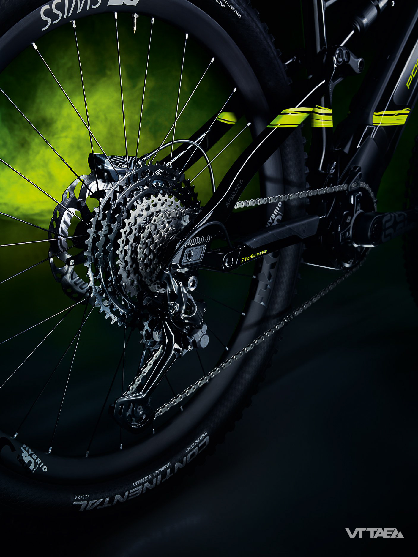 On retrouve les nouvelles suspensions DT Swiss 535 One (fourche et amortisseur), des freins 4 pistons et transmission Shimano XTR, des roues DT Swiss HXC1200 Spline carbones avec pneus Continental MountainKing 27,5×2.6…