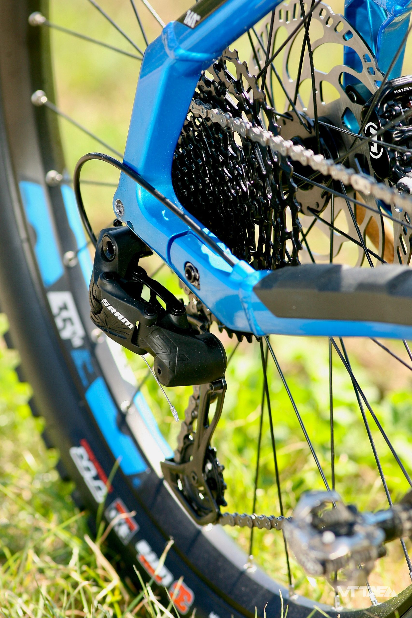 Et puis pour un bike à moins de 5000 euros, l’équipement n’est pas pour autant au rabais, avec des freins Magura MT5 4 pistons et disques de 203 mm, des jantes Rodi tubeless ready en 30mm de largeur (AV) et 35mm (AR) et une transmission Sram SX Eagle 12 vitesses.