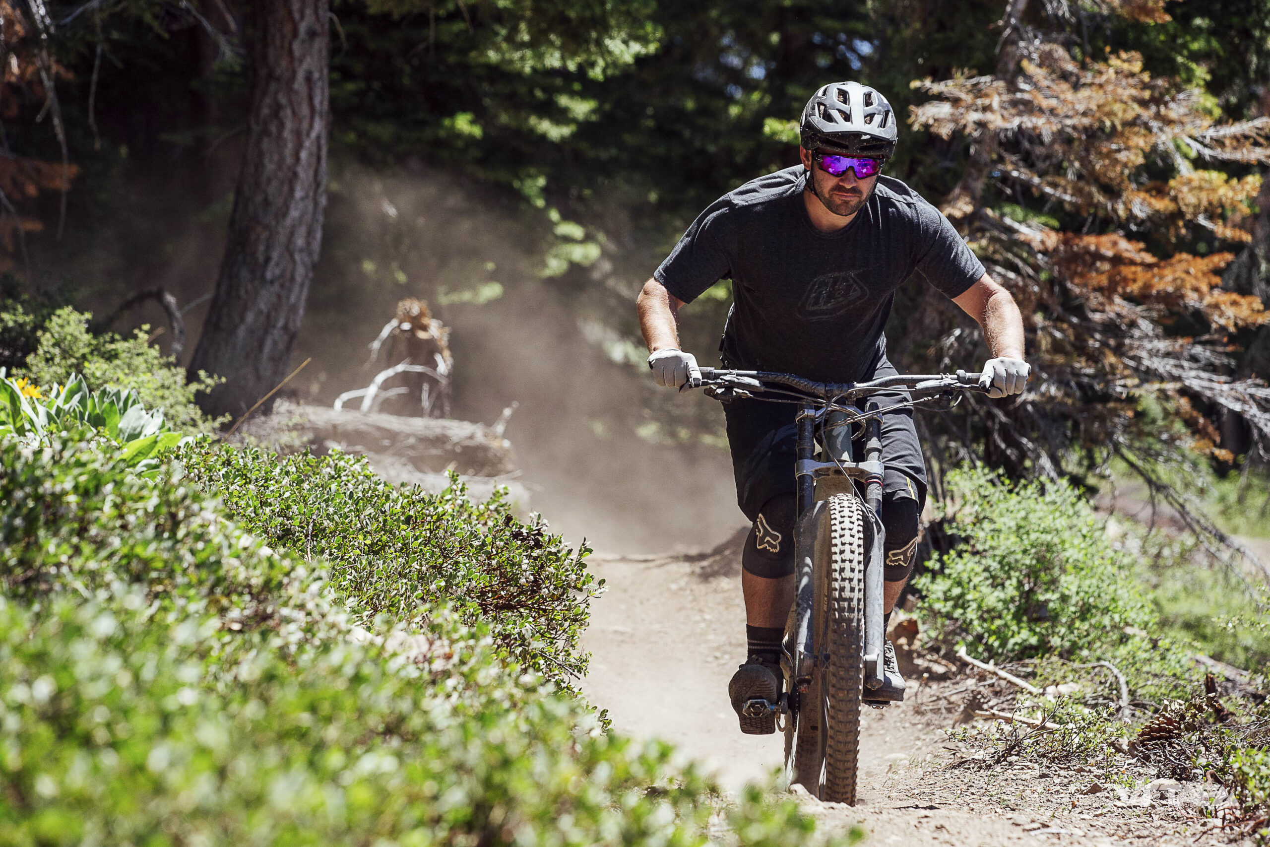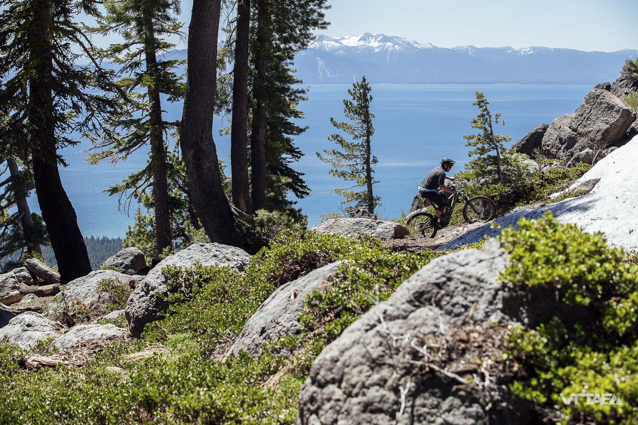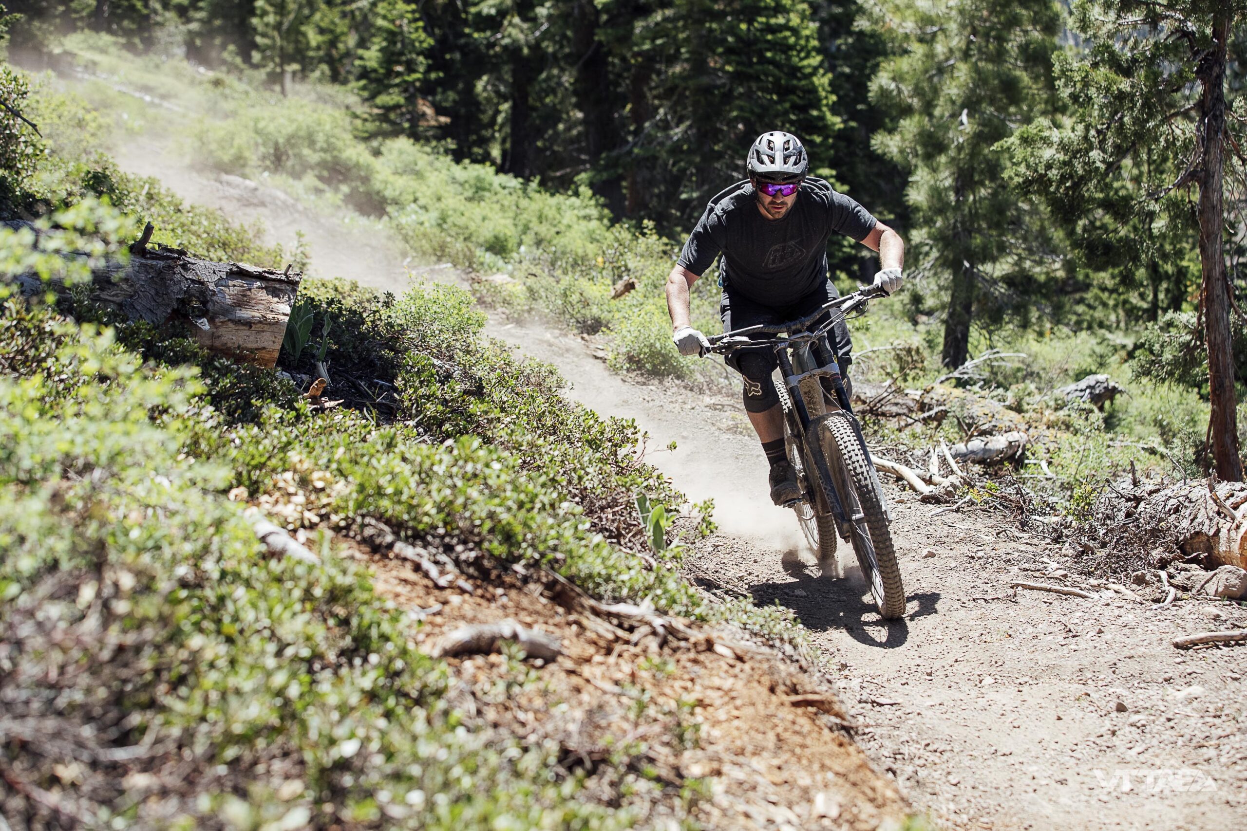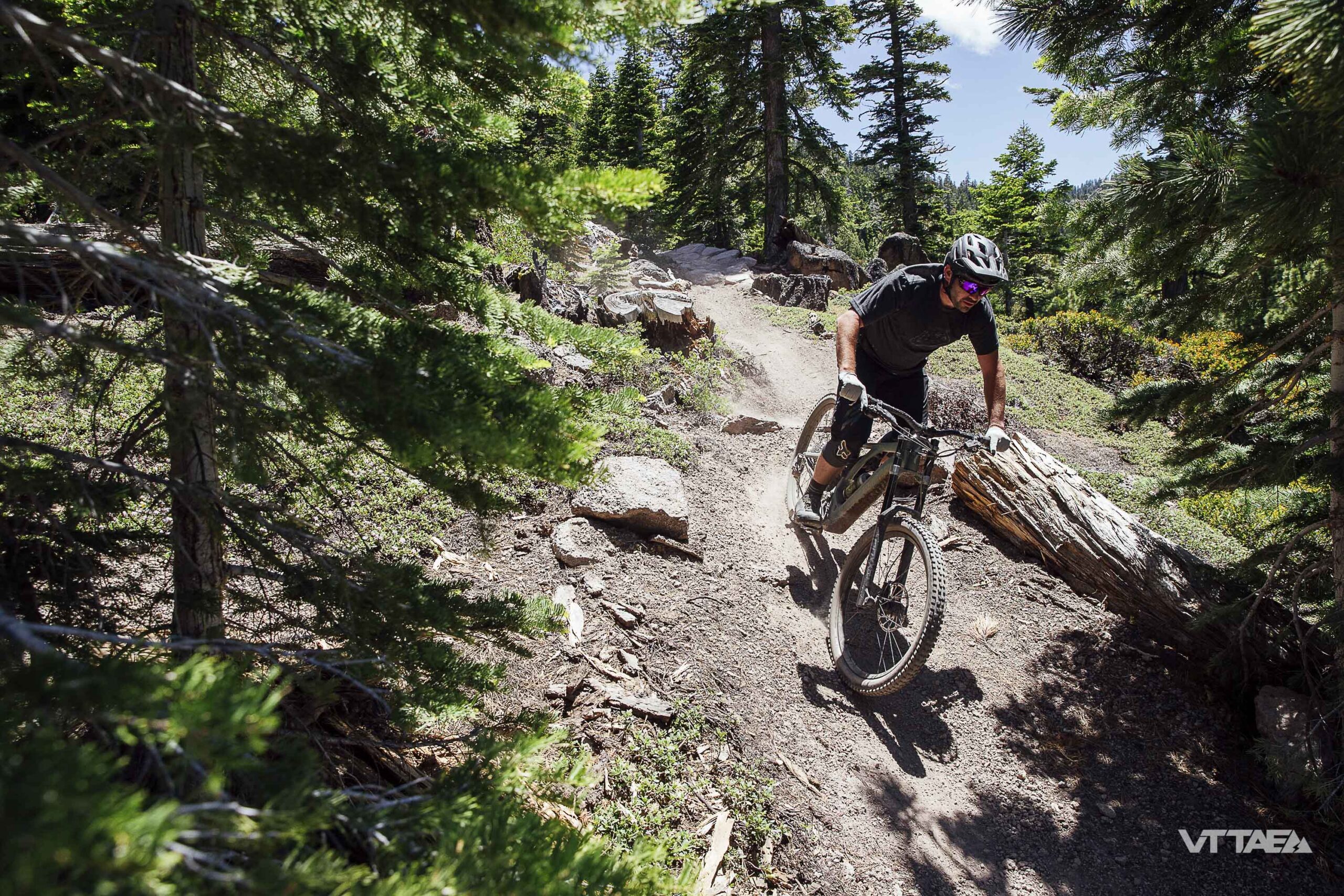 La grande majorité de notre parcours de test à Northstar (Californie) surplombant le lac Tahoe, loin du bike-park, était typée All Mountain. C’était beau, ça a permis de faire de belles photos dans la poussière mais quand même, c’était très lisse et peu pentu. Et loin d’être technique. Du coup, revers de la médaille, on ne va pas vous vendre une prise en main sur VTTAE.fr qui ne serait pas représentative du programme du vélo, sur des parcours que l’on a testé deux jours plus tôt en semi-rigide de XC…