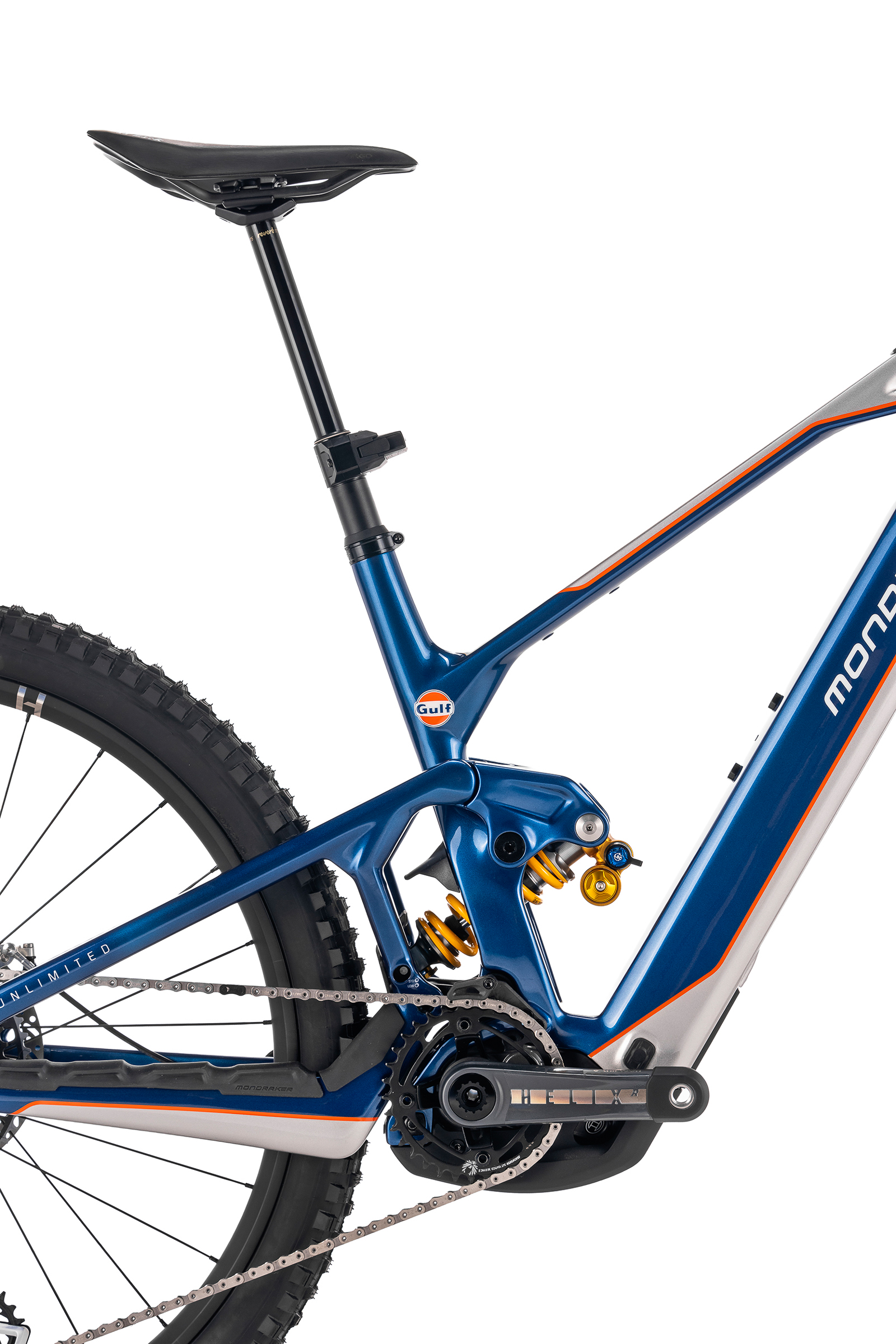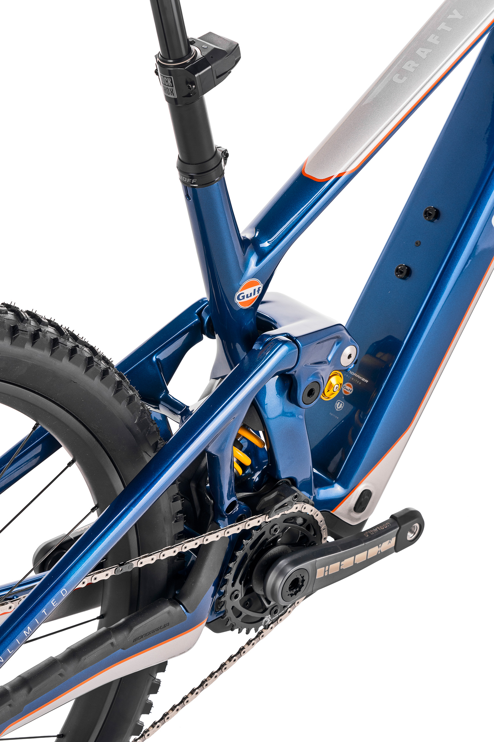 Avec sa peinture unique réalisée à la main et ses composants d’exception, le Mondraker Crafty Carbon Unlimited Gulf Edition ne ressemble à aucun autre modèle de la gamme Crafty… Les heureux possesseurs de cette série limitée auront donc entre les mains un engin au design unique d’une valeur inestimable pour les collectionneurs, qui rassemble harmonieusement sport automobile et artisanat de pointe. Quoi de mieux pour conclure un partenariat avec Gulf parfaitement aligné avec les versions déjà personnalisées du Neat et du Dusty X découvertes précédemment ? Joli.